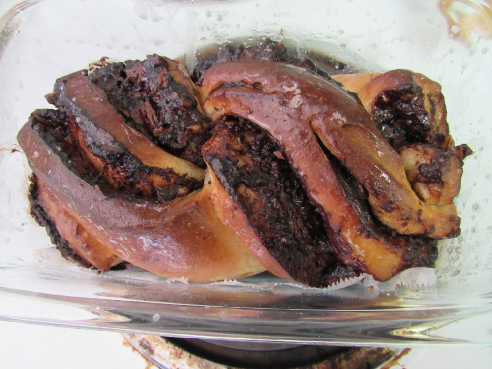 Since my friend was still disappointed over the lack of icing in our “clone of a cinnamon roll” episode, we made all of the sugar syrup that this recipe called for. But like the orange cake I made from this cookbook, we really did not need all of the syrup. The syrup hardens as the pastry cools like a donut glaze and this pastry is so decadent already.